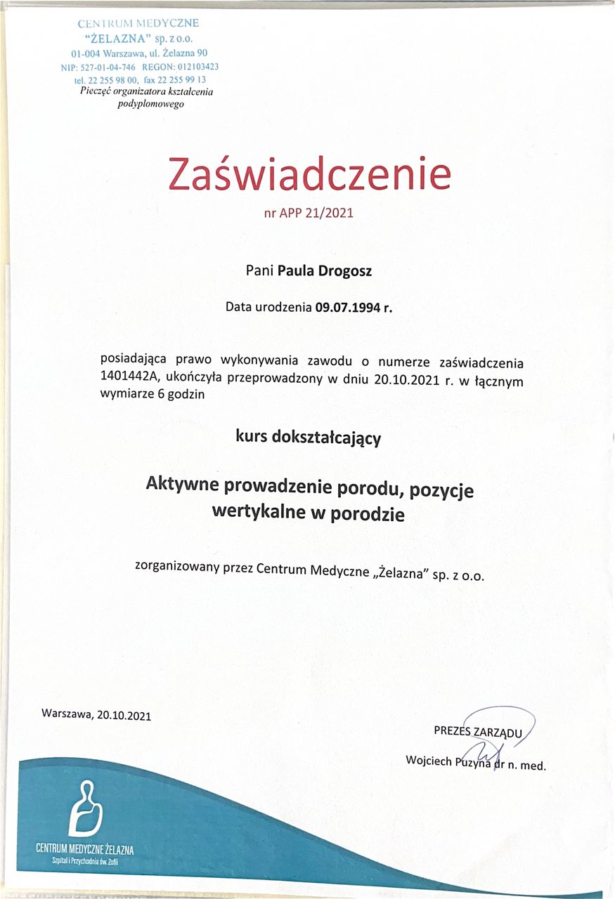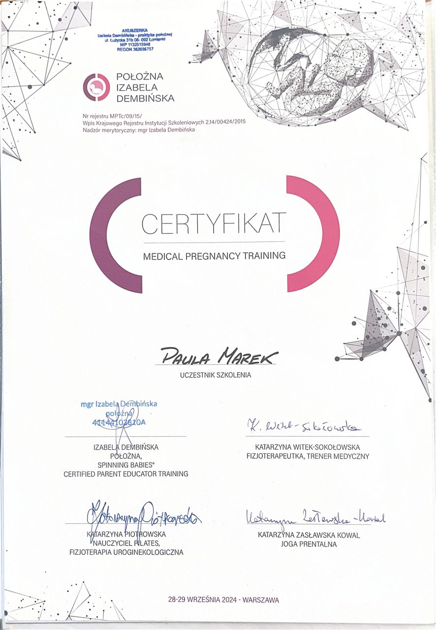 Posiadam certyfikat Medical Pregnancy Training, stale rozwijam się w obszarze fizjoterapii uroginekologicznej oraz wpływu aktywności ruchowej na przebieg porodu.