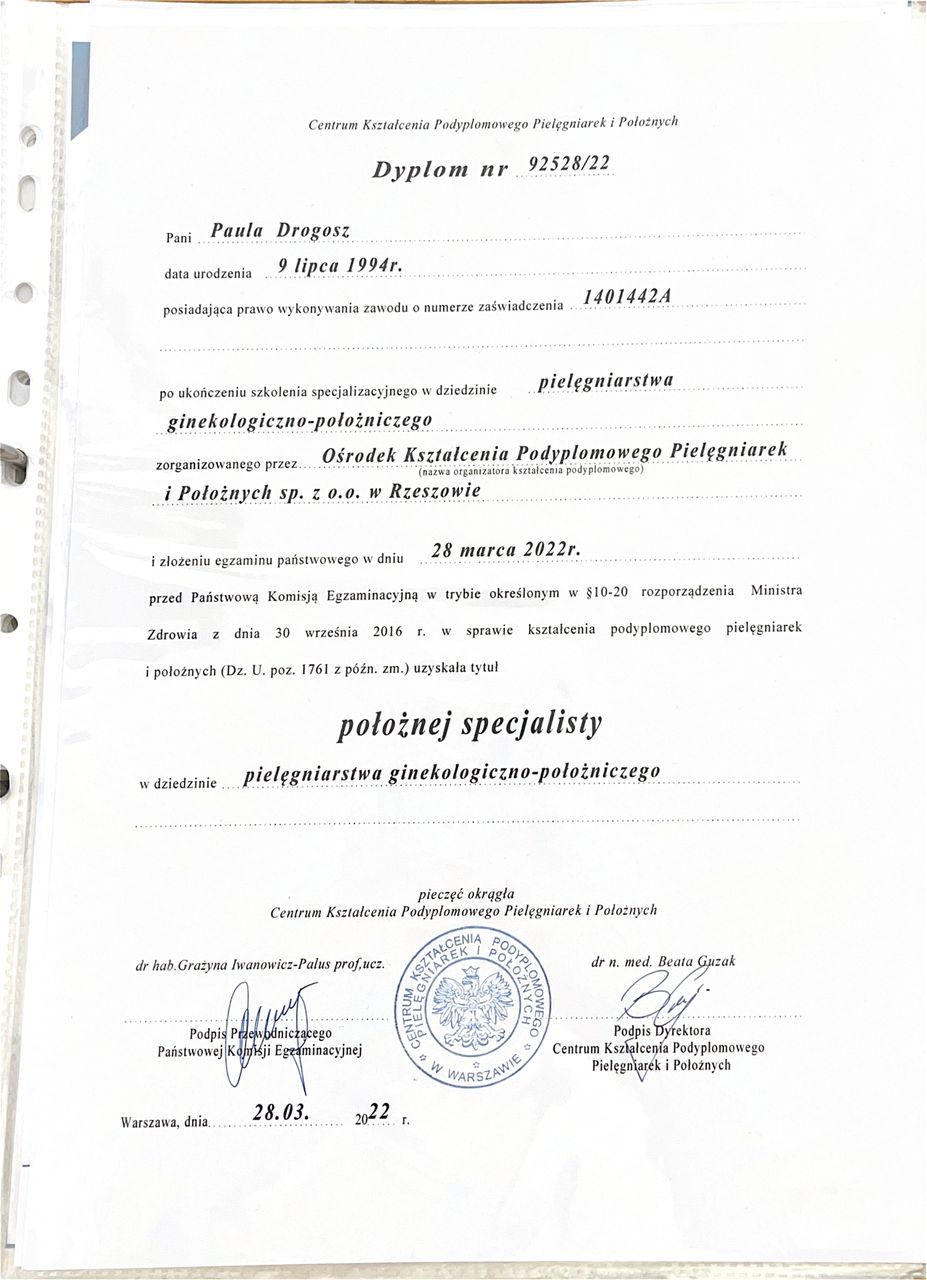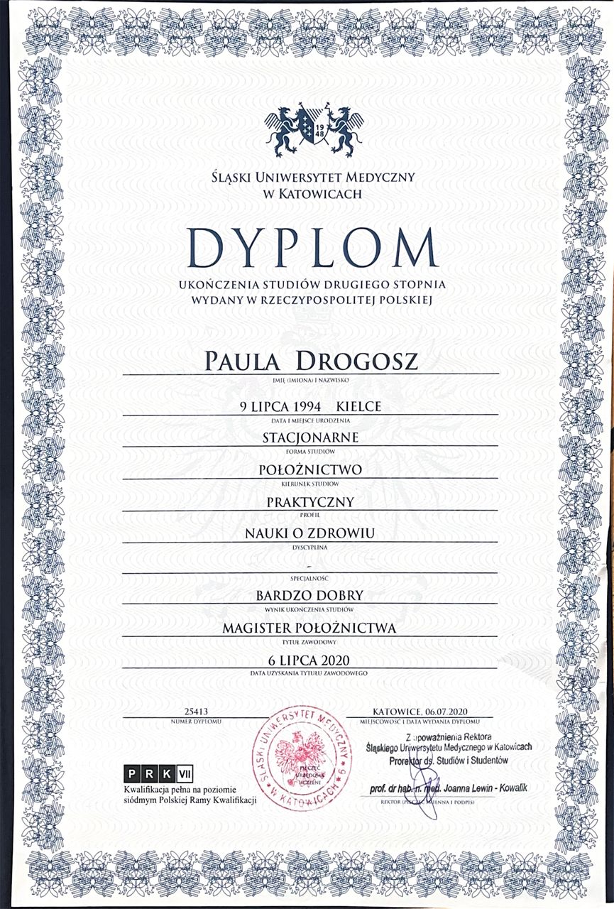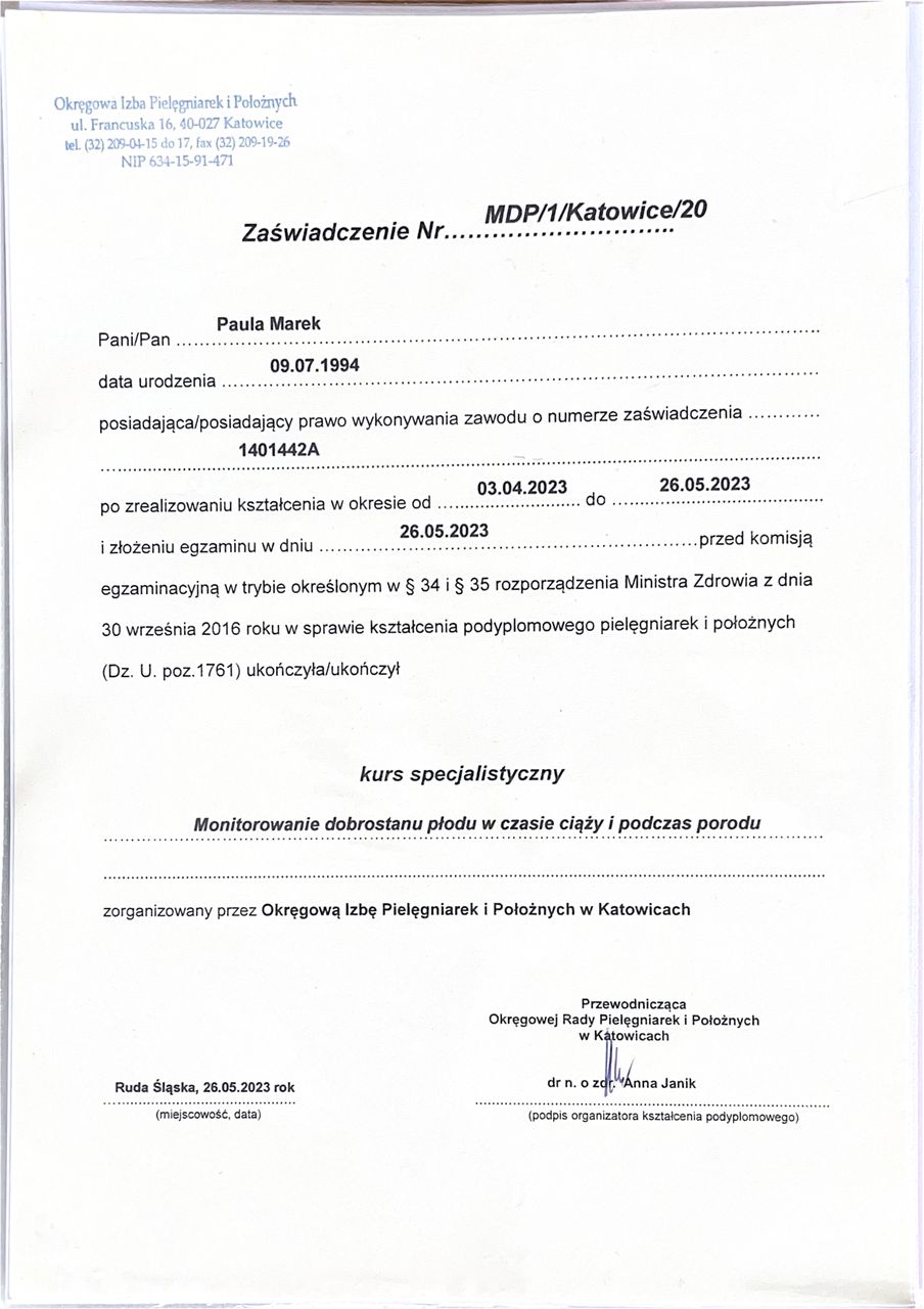 W 2020 roku uzyskałam tytuł magistra położnictwa, kończąc studia na Śląskim Uniwersytecie Medycznym w Katowicach, a w 2022 roku zdobyłam tytuł specjalisty w dziedzinie pielęgniarstwa ginekologiczno-położniczego.