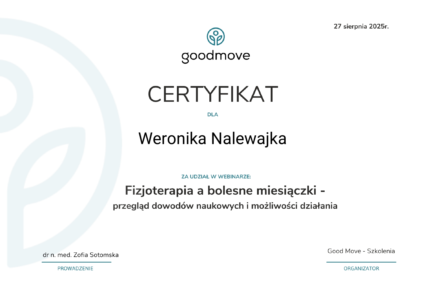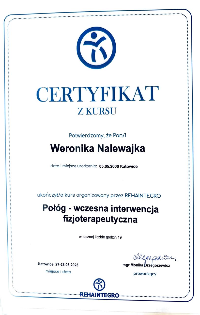 Nazywam się Weronika Nalewajka. W 2024 roku uzyskałam tytuł magistra fizjoterapii, a od 2021 roku poszerzam swoją wiedzę w zakresie fizjoterapii uroginekologicznej.