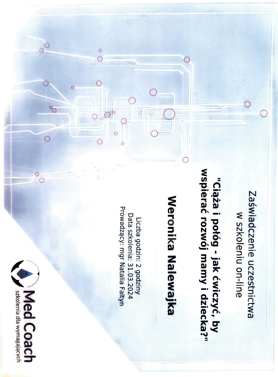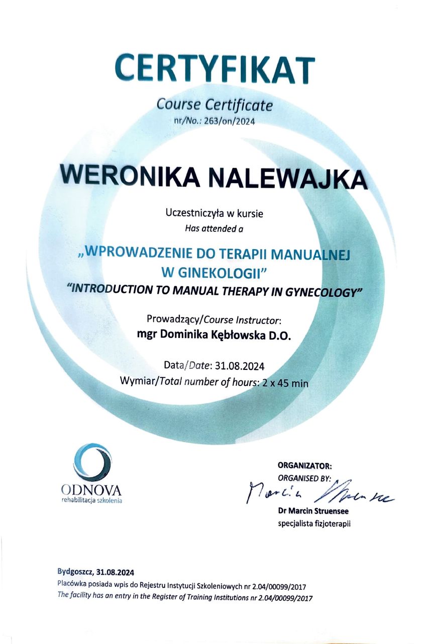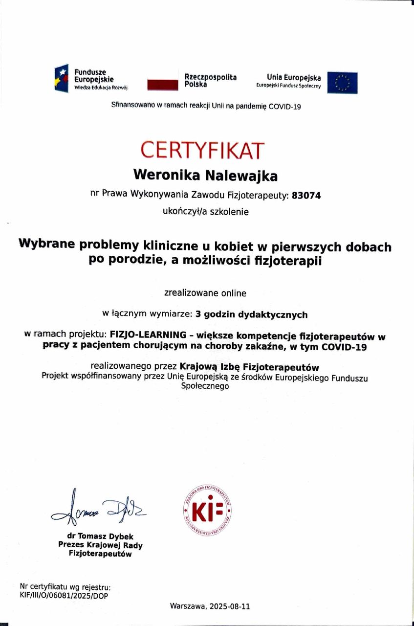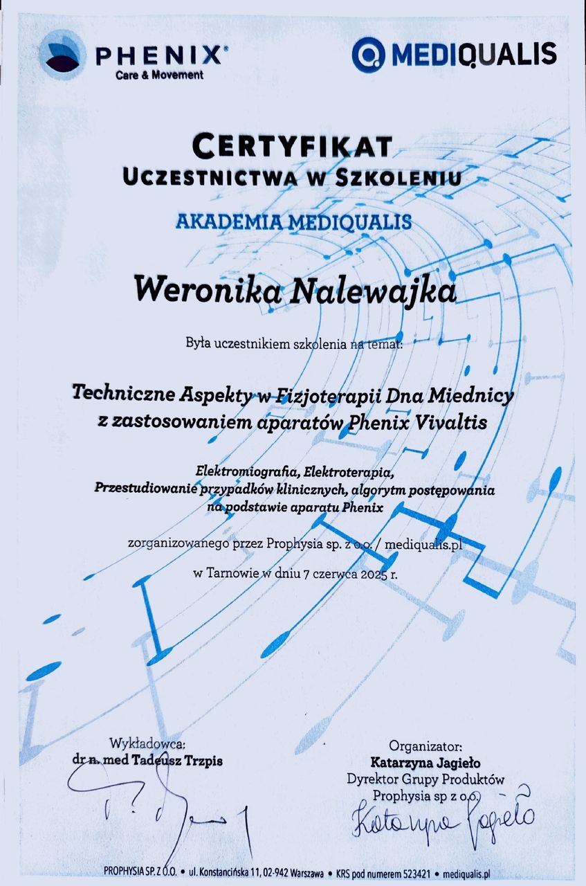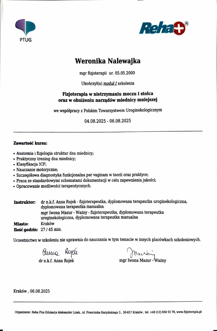 Weronika Nalewajka to zaangażowana fizjoterapeutka uroginekologiczna, łącząca praktykę kliniczną z działalnością naukową i dydaktyczną. Dzięki licznym szkoleniom, konferencjom oraz doświadczeniu w pracy z kobietami w ciąży, po porodzie i z problemami dna miednicy, oferuje profesjonalne, indywidualne i pełne wsparcie, budując zaufanie oraz poczucie komfortu każdej pacjentki.